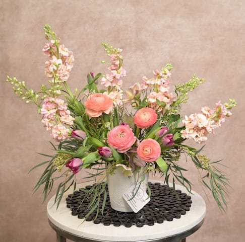Design-driven, not template-driven. Our arrangements aren’t pulled from a catalog. Every composition considers color theory, proportion, negative space, and the personality of the blooms themselves. This is the approach that earned us a featured role at the North Carolina Museum of Art’s annual Art in Bloom exhibition. It’s also the standard we hold for a Tuesday delivery in Five Points.